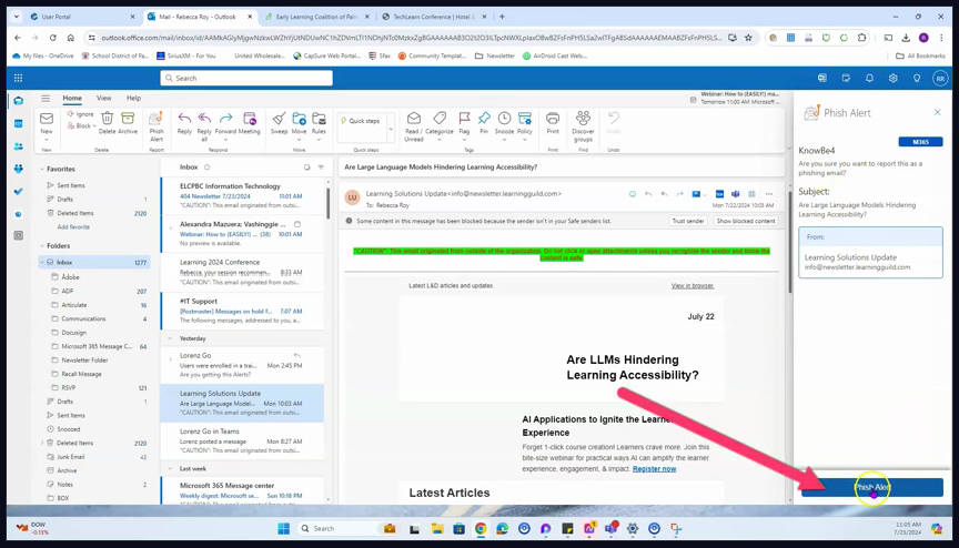 you’ll notice the Phish Alert button appears on the top ribbon.
